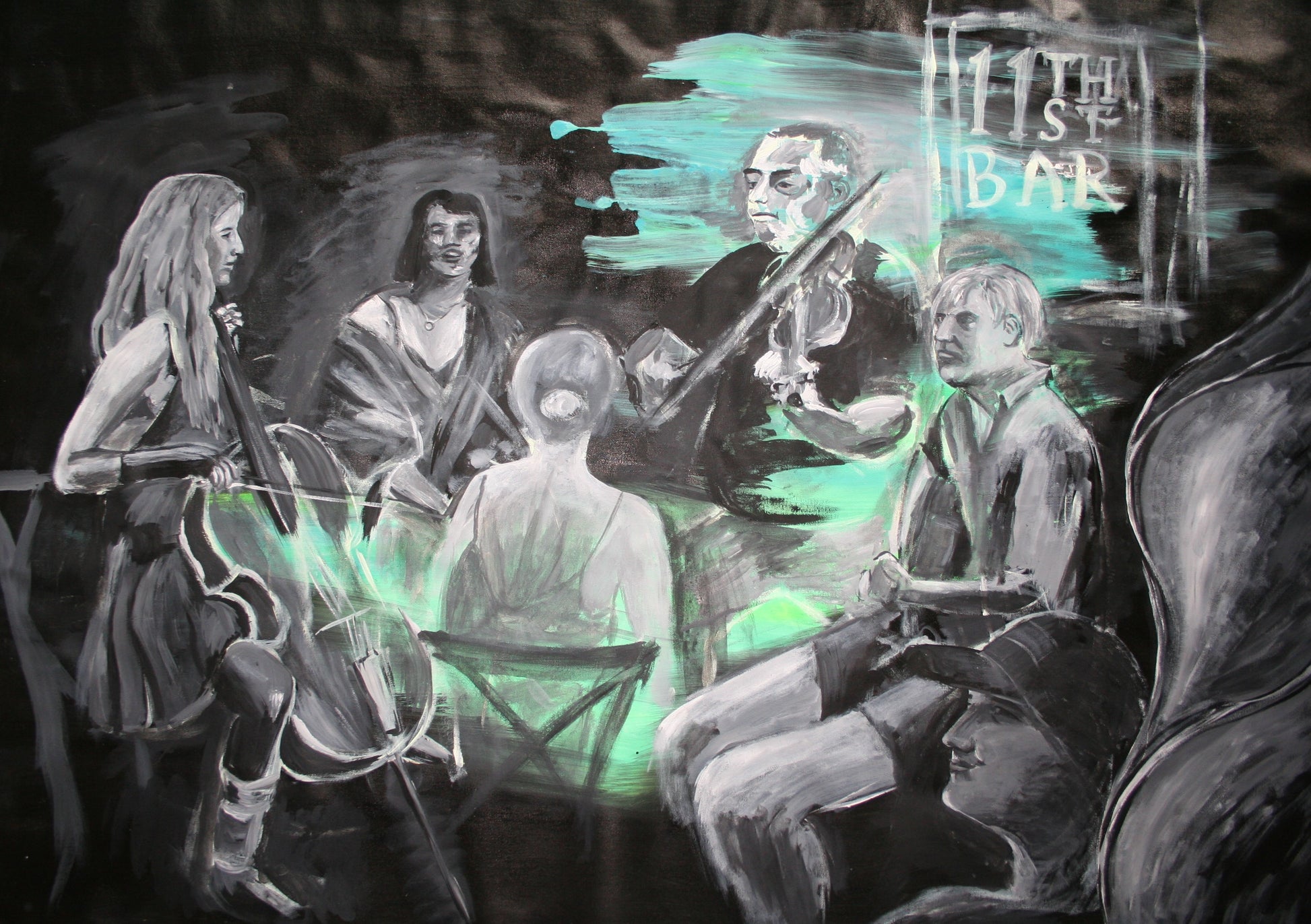 I love going to an Irish bar and listening to Irish music. As a result, I got the idea to create a large acrylic painting with musicians. This is a figurative composition with musicians playing traditional Irish music in a bar.