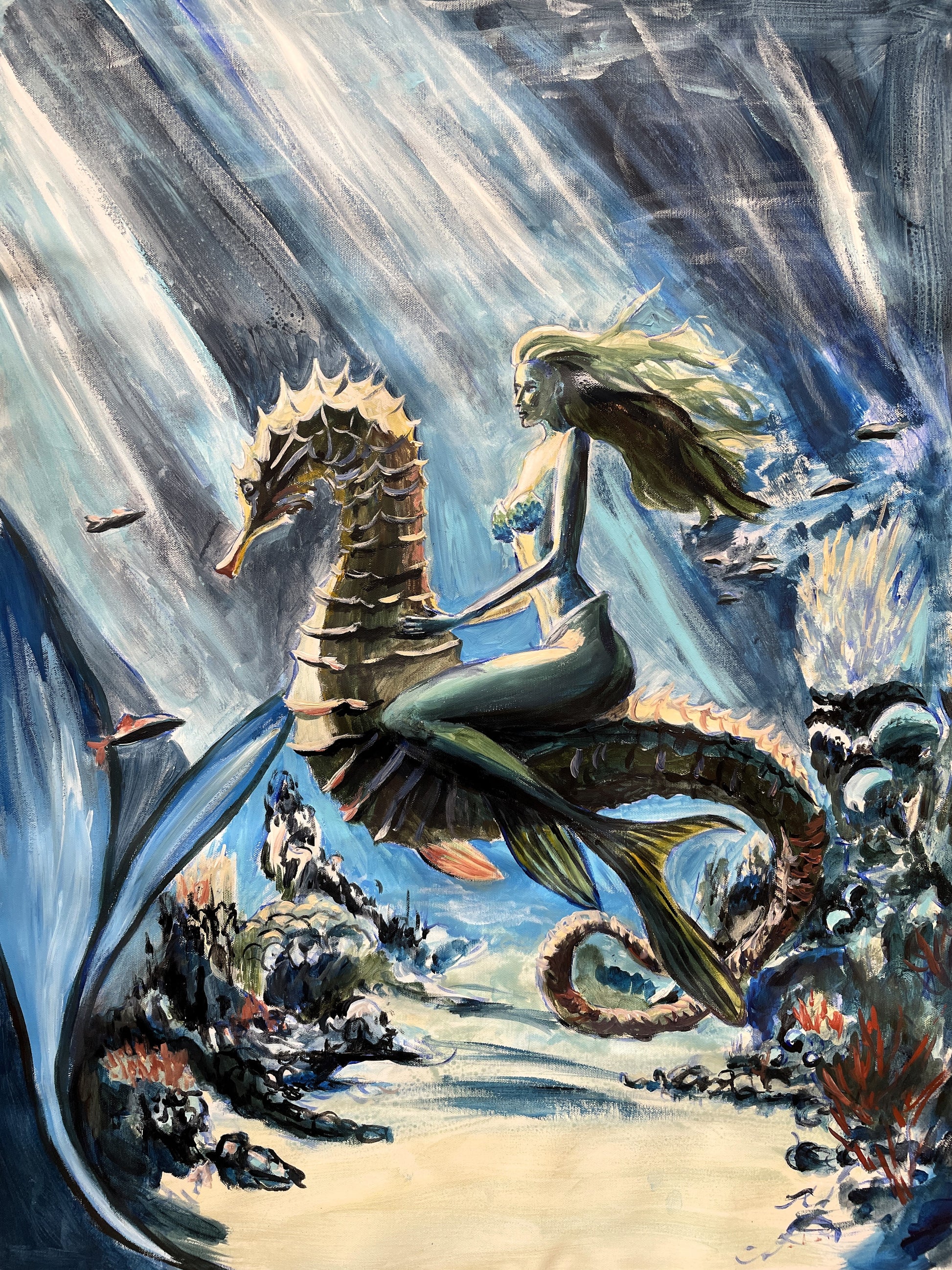Embark on a "Deep Journey," a visual odyssey that captures the essence of marine mystique and the spellbinding bond between a mermaid and her seahorse. This painting is a portal to an undersea realm where fantasy is as tangible as the waves and where the grace of mythological companionship is celebrated in every hue and curve.