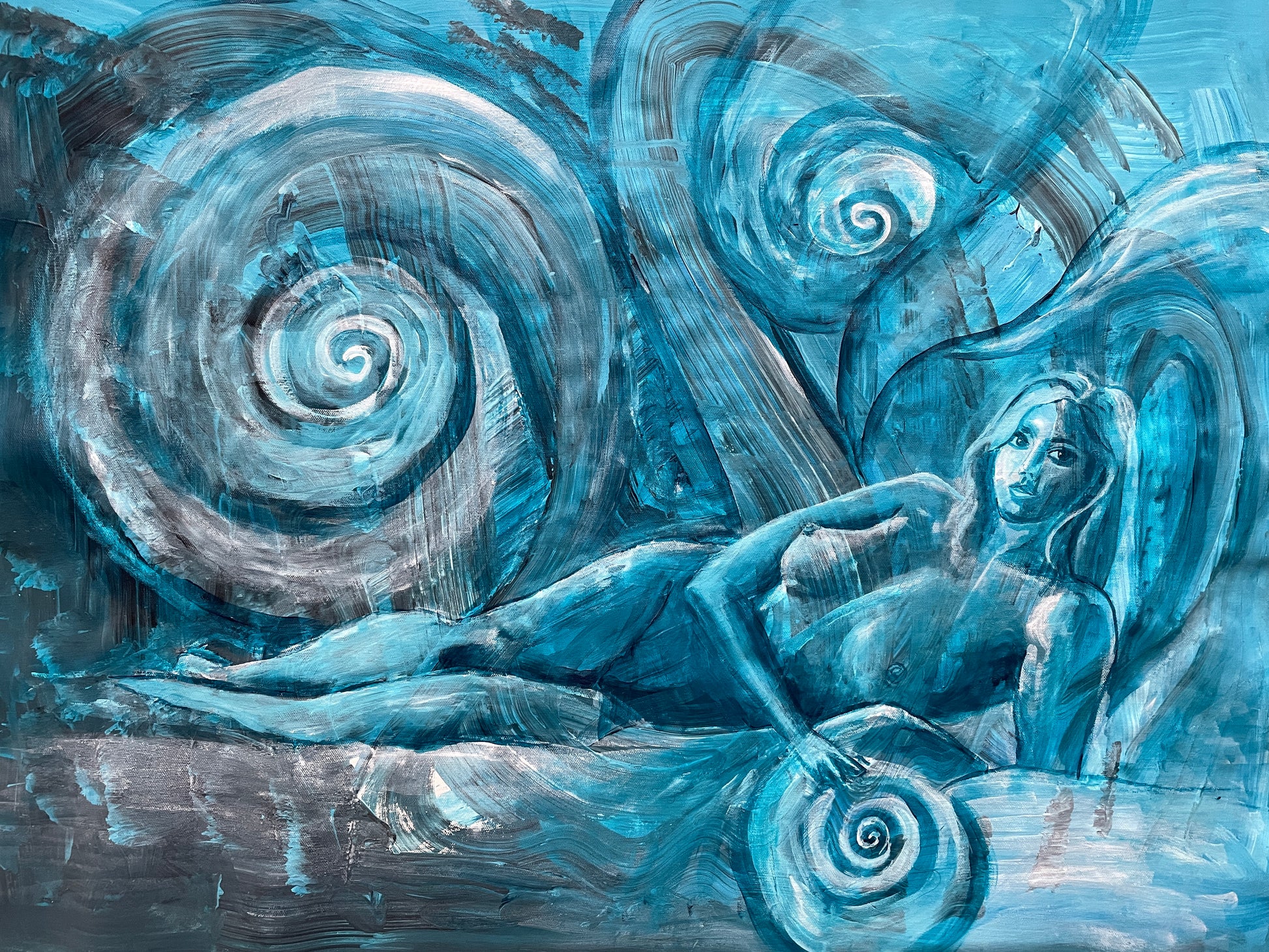 This piece invites the viewer to imagine: What is her dream? Is she longing for a love that transcends reality, or is she herself the embodiment of someone’s deepest desire? The composition is both intimate and universal, capturing the delicate balance between vulnerability and allure. The abstract spirals symbolize the infinite possibilities of the imagination, pulling us deeper into the mystery of what we dream and who we dream of.