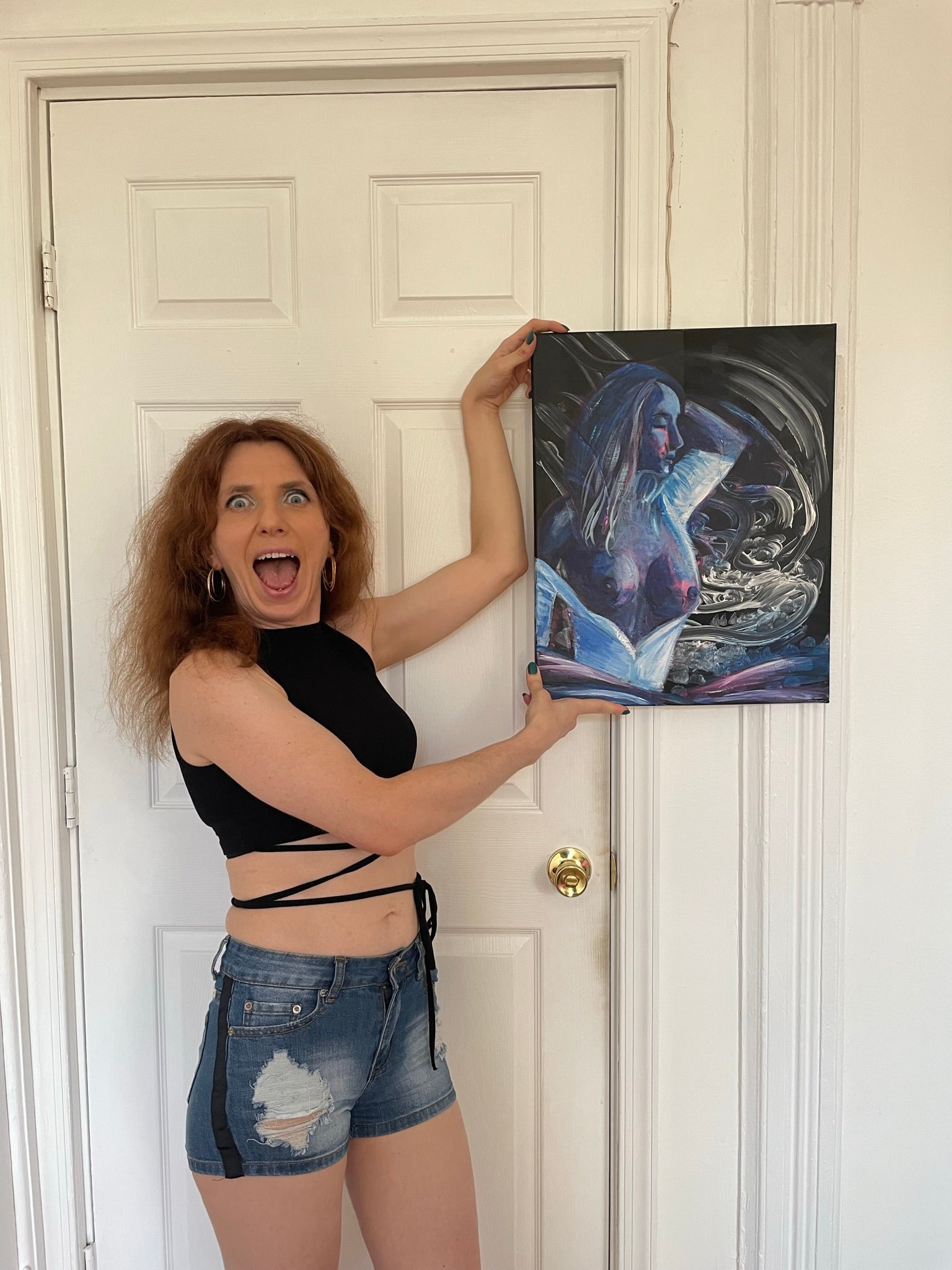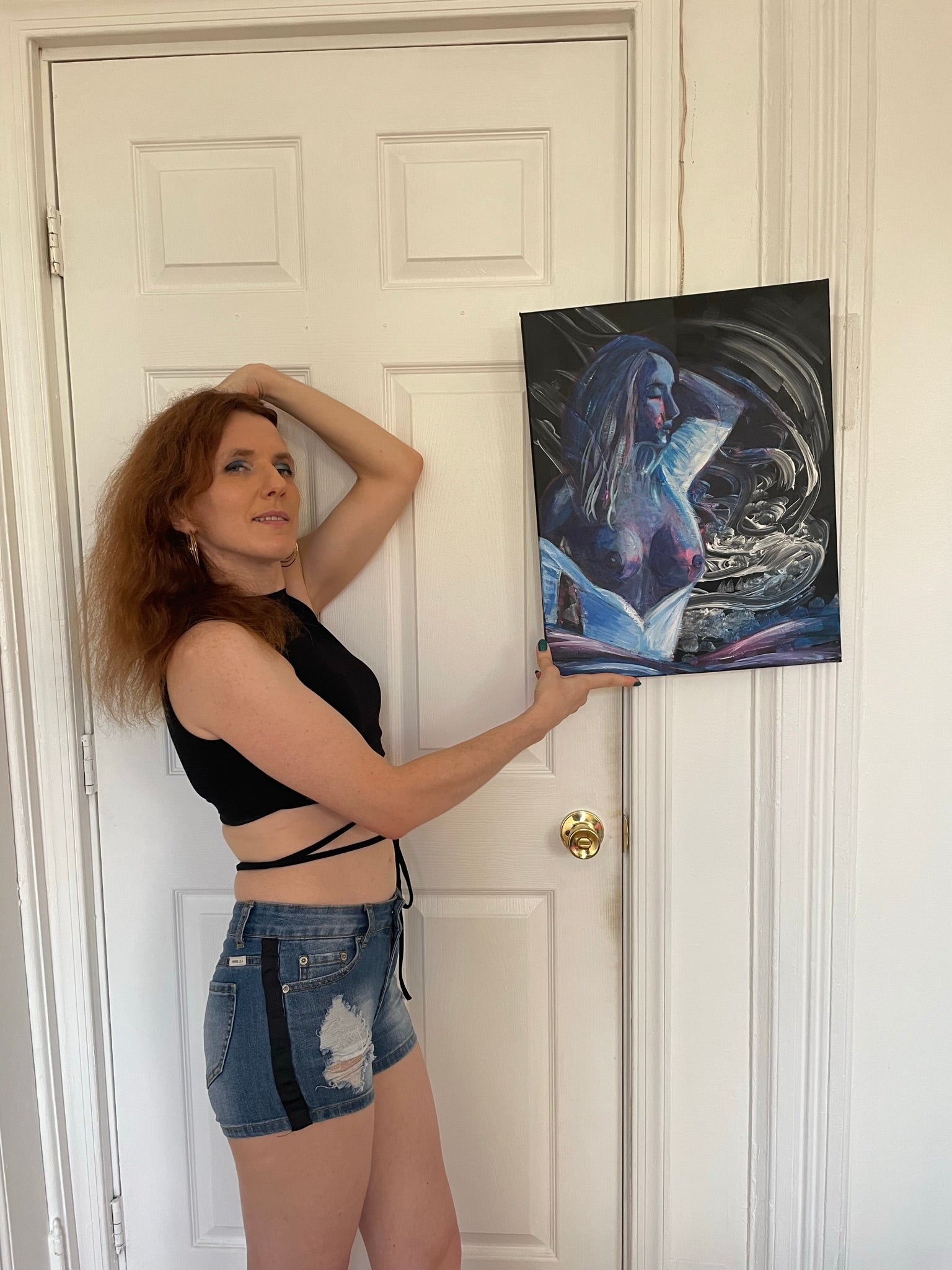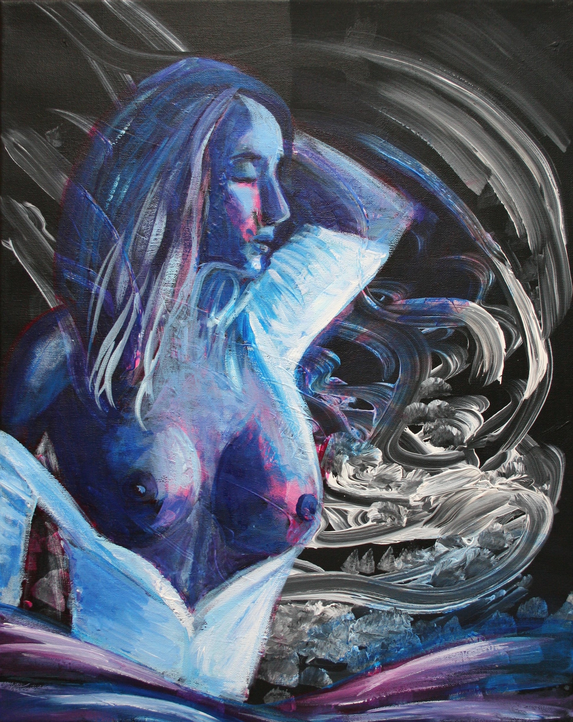 Immerse yourself in the enchanting world of "Familiar Feeling," a mesmerizing nude painting that exudes allure with its enthralling blend of blue and violet tones against a dark background. In this exquisite artwork, a young woman's shirt is undone as she stands with closed eyes, as if trying to embrace a familiar feeling in the gentle caress of the wind.