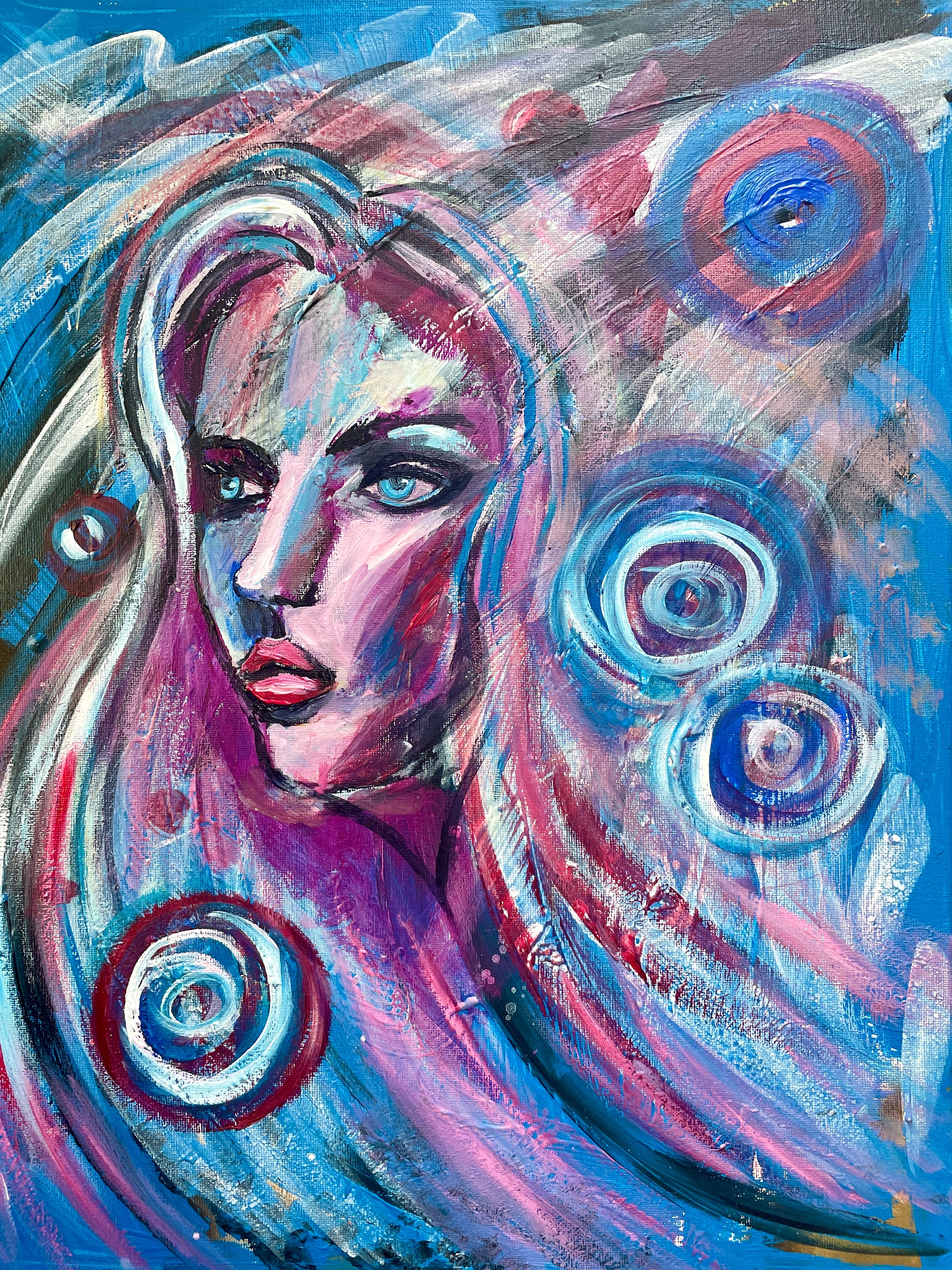 In this piece, a woman's visage materializes from a swirl of vibrant colors and dynamic shapes, suggesting the fluid and ever-changing nature of memory. The interplay of blues, pinks, and purples creates a dreamlike atmosphere, evoking the sensation of drifting through layers of time and space. Her eyes, vivid and piercing, draw you in, offering a glimpse into the stories and emotions that lie beneath the surface.