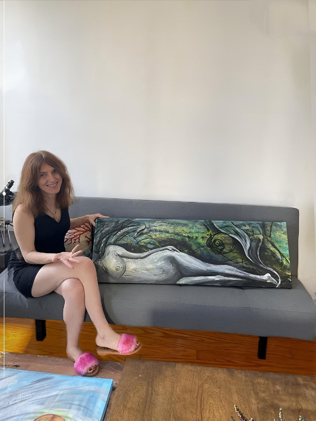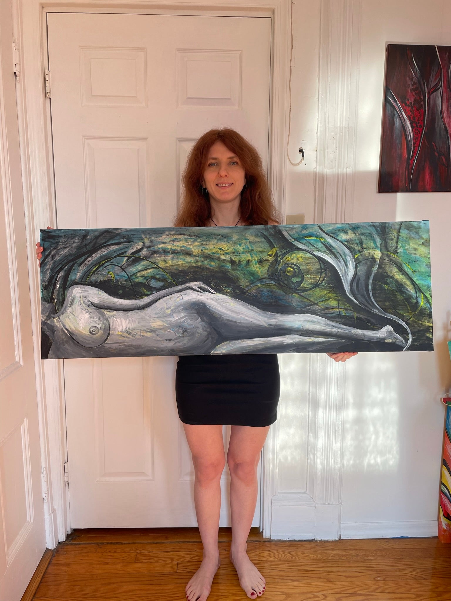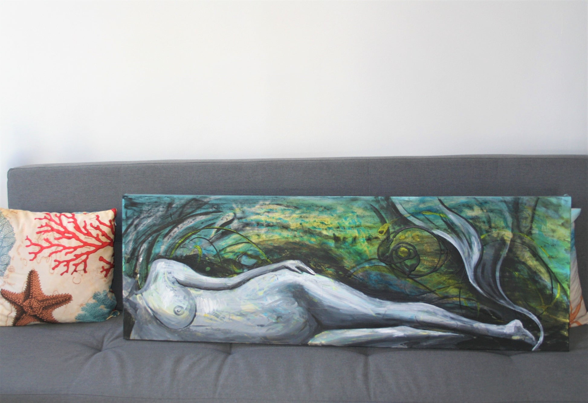 As the artist behind this unique and striking painting, I am excited to share my work with you. This piece is a long, horizontal shape nude painting, perfect for displaying in your home or bedroom.