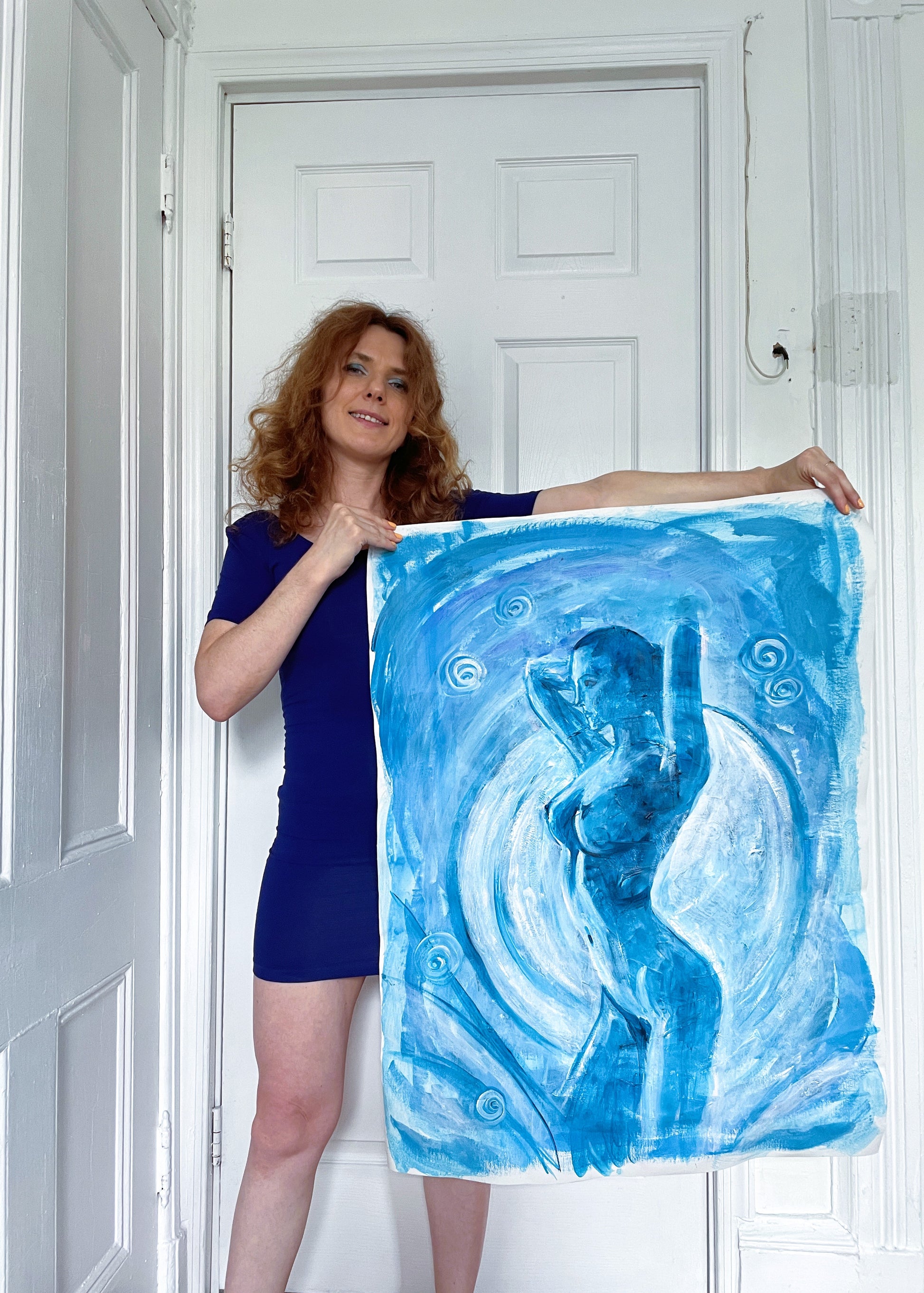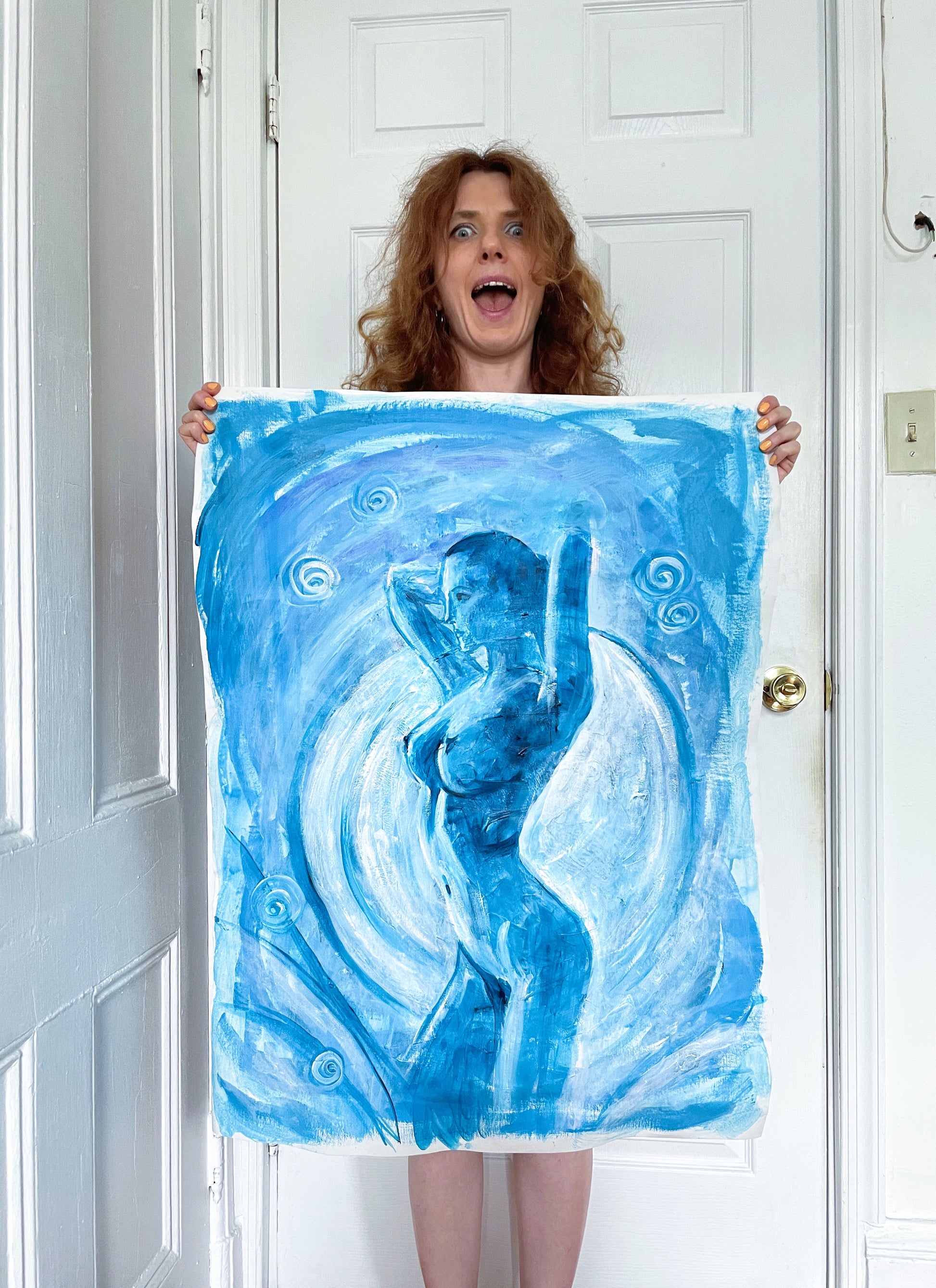 The cool, calming palette of blues and whites envelops the figure, creating a dreamlike atmosphere that invites the viewer to ponder the unseen aspects of identity and experience. The painting is both a celebration of the present moment and an invitation to explore the past, with the promise of creating new and meaningful connections in the future.