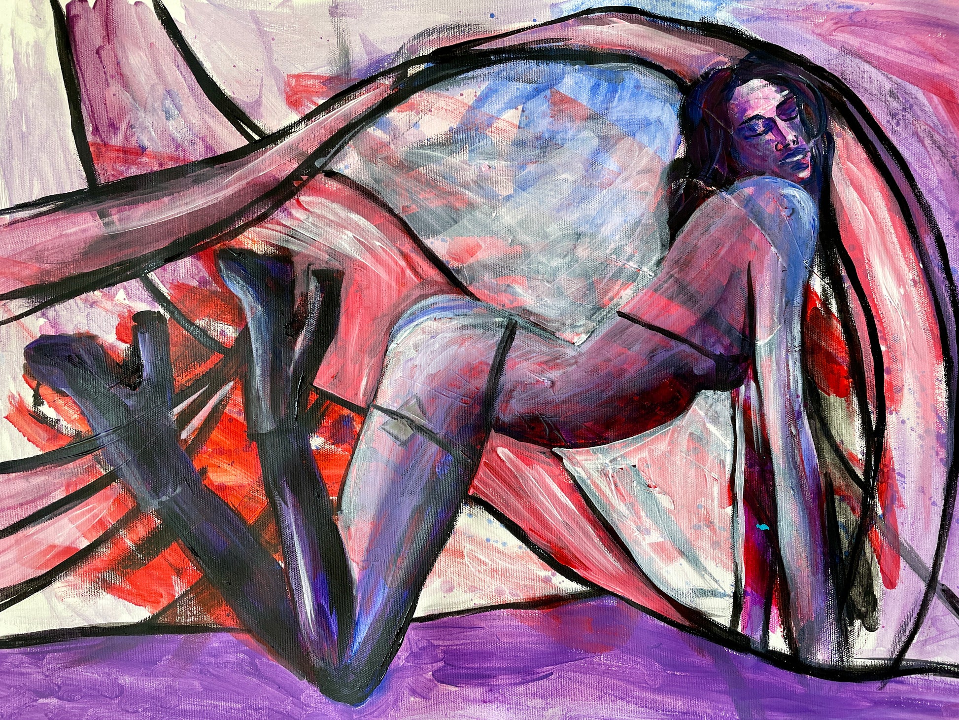 "On the Bar Counter" is a vivid and dynamic portrayal of the vibrant nightlife in Brooklyn, capturing the essence of New York City's iconic strip bars. This painting features a mesmerizing dancer, gracefully poised on the bar counter, exuding confidence and allure. Her figure is beautifully contoured with bold, expressive lines and a rich palette of purples, reds, and blacks, creating a striking contrast that draws the viewer's eye.