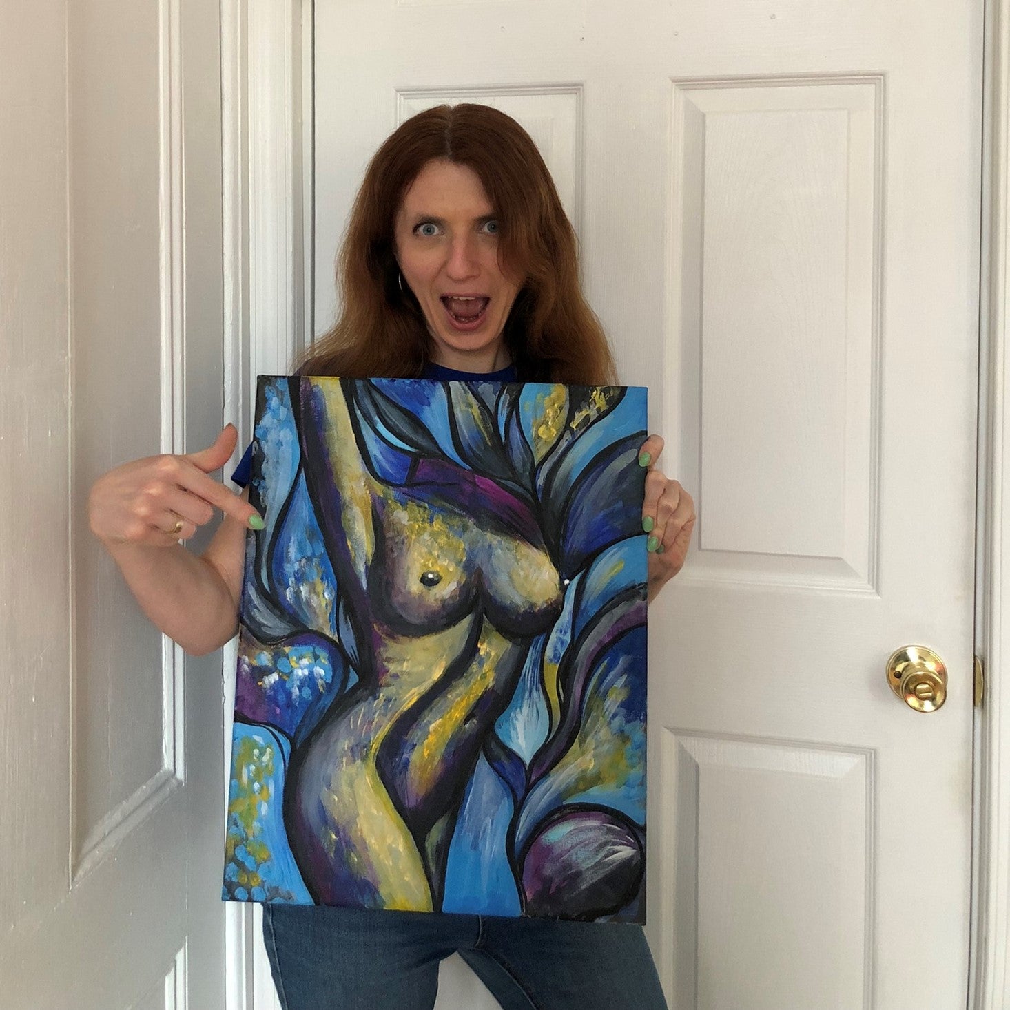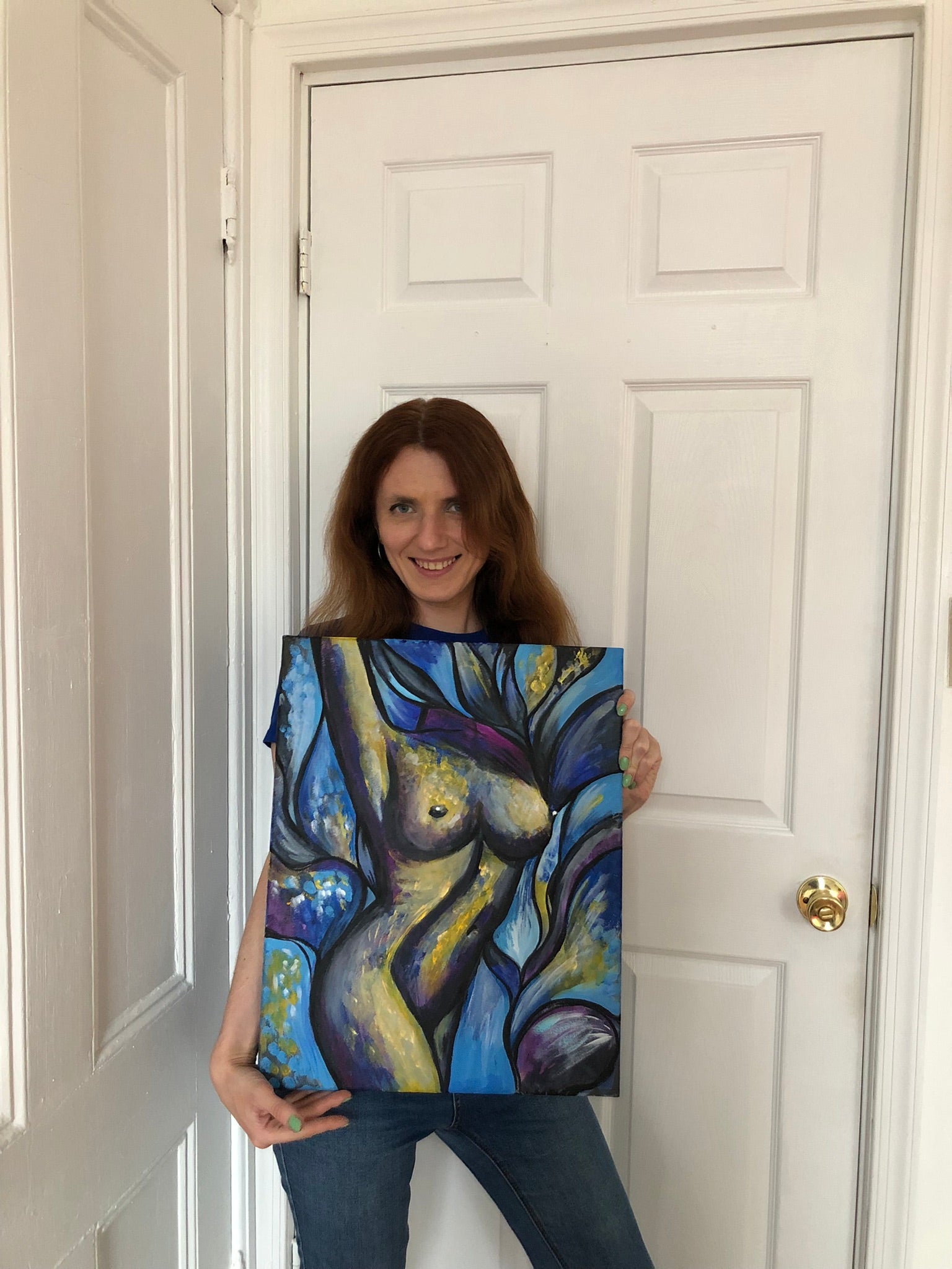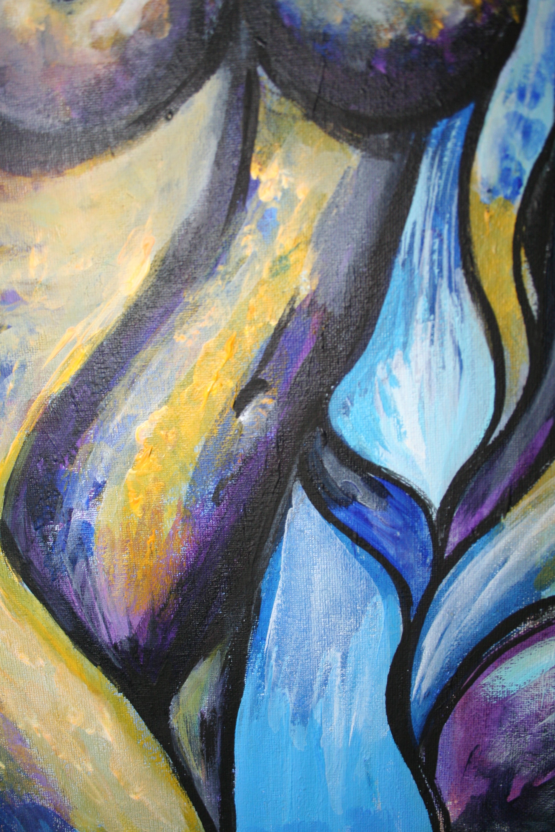 Smell of lavender; acrylic on canvas, 2022; 50 x 40 centimeters; 19.5 x 16 inches A beautiful naked female body is painted with bright and dark acrylic paints. This is especially for you! Ready to hang on your bedroom wall or wherever you like