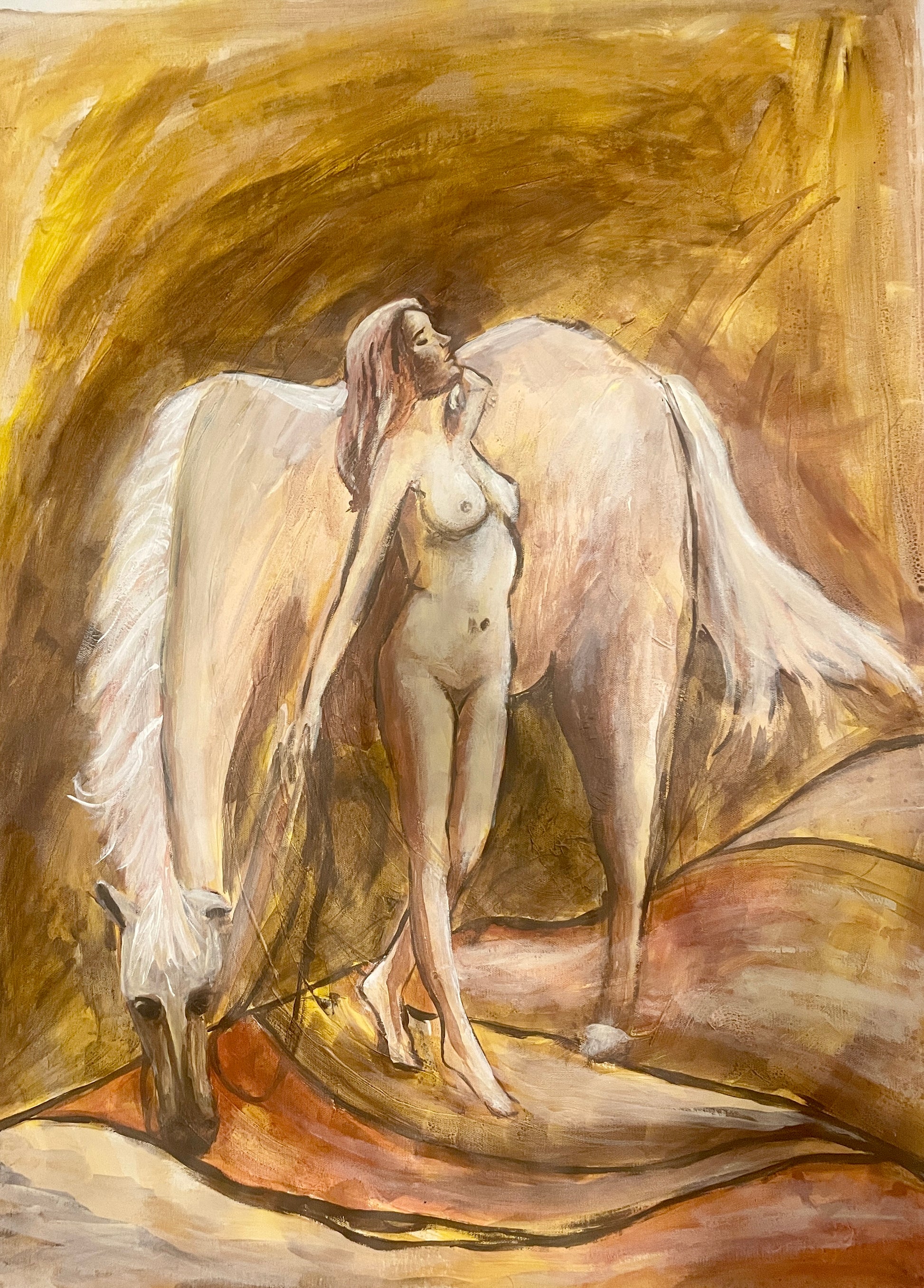 In this evocative scene, the woman stands gracefully alongside her equine companion, their forms blending seamlessly into the warm, earthy tones of the background. The gentle curve of her body and the soft, nurturing gaze towards her horse suggest a deep understanding and mutual respect. The horse, equally serene, embodies the tranquility and strength of nature, grounding the composition in a sense of timeless peace.