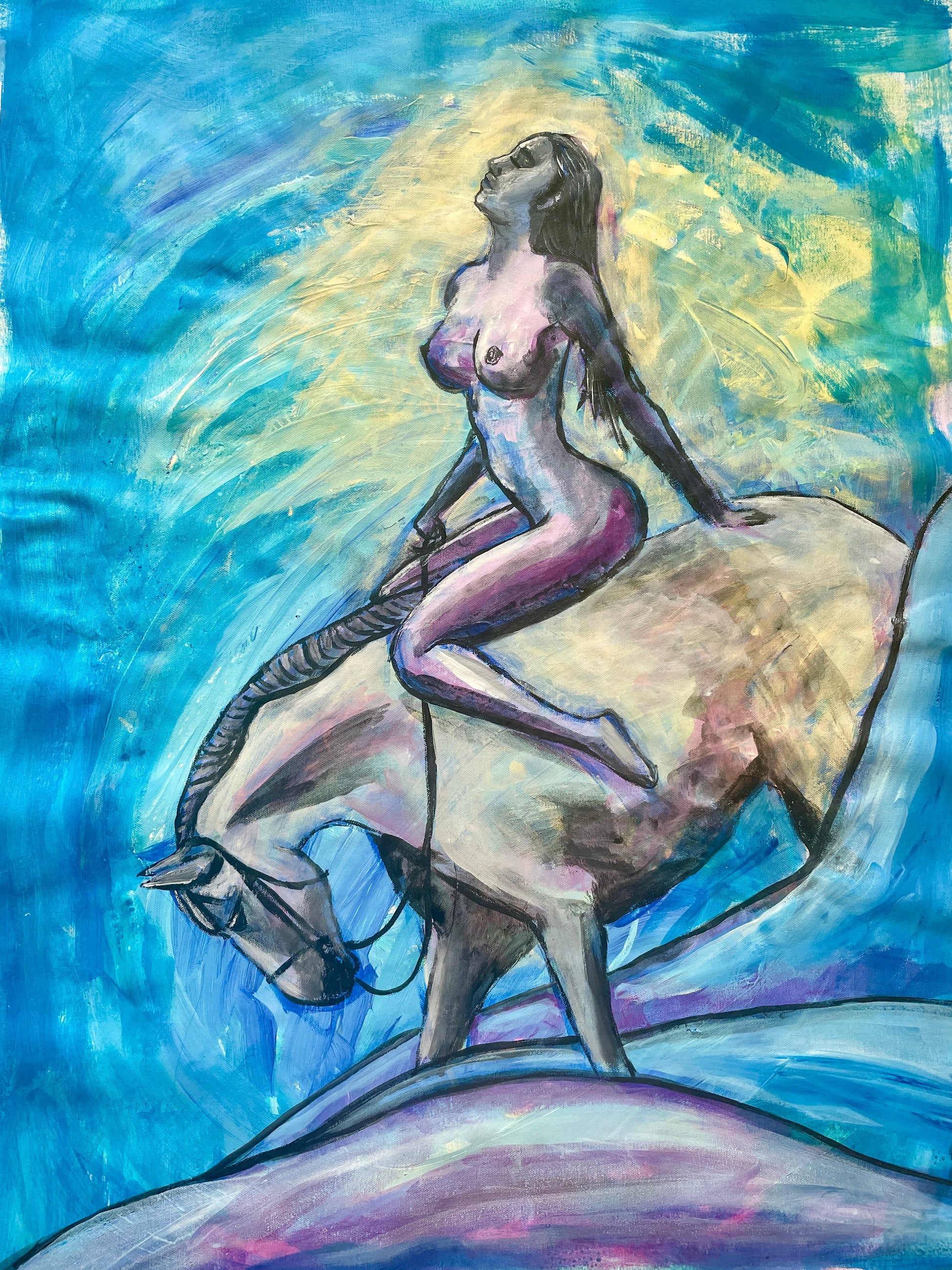 "Turn to Where the Sun Is" is a vibrant and uplifting painting that embodies the spirit of living authentically and following one's intuition. This artwork captures a moment of pure freedom and connection with nature, as a nude woman, mounted on a majestic horse, turns her face towards the sun, basking in its warm, golden glow.