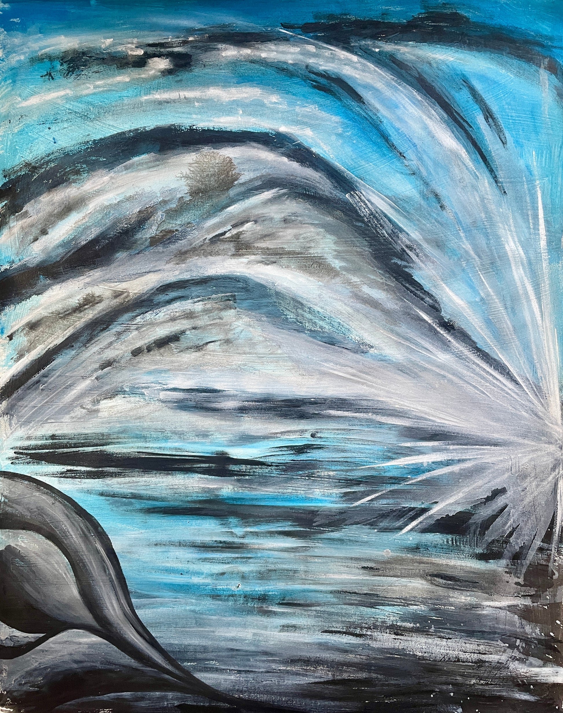 Sweeping strokes of silver and charcoal give way to an explosion of cyan and light. The composition is cinematic in scale, bold in gesture, and deeply optimistic in spirit. This is not the light at the end of the tunnel — this is the light that comes through the wall you never thought to look at.