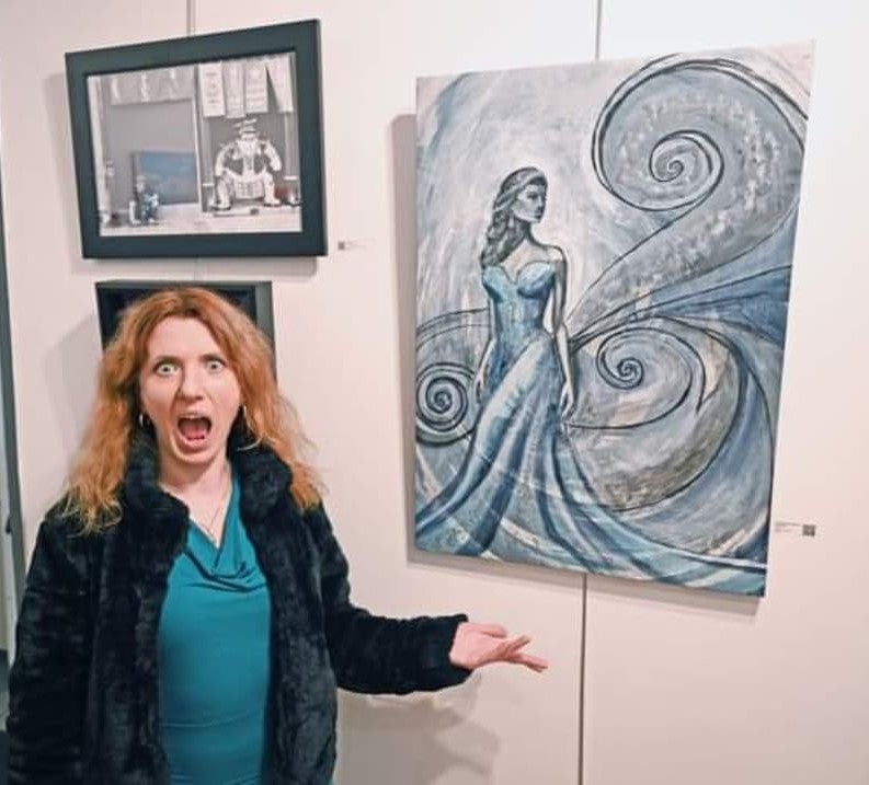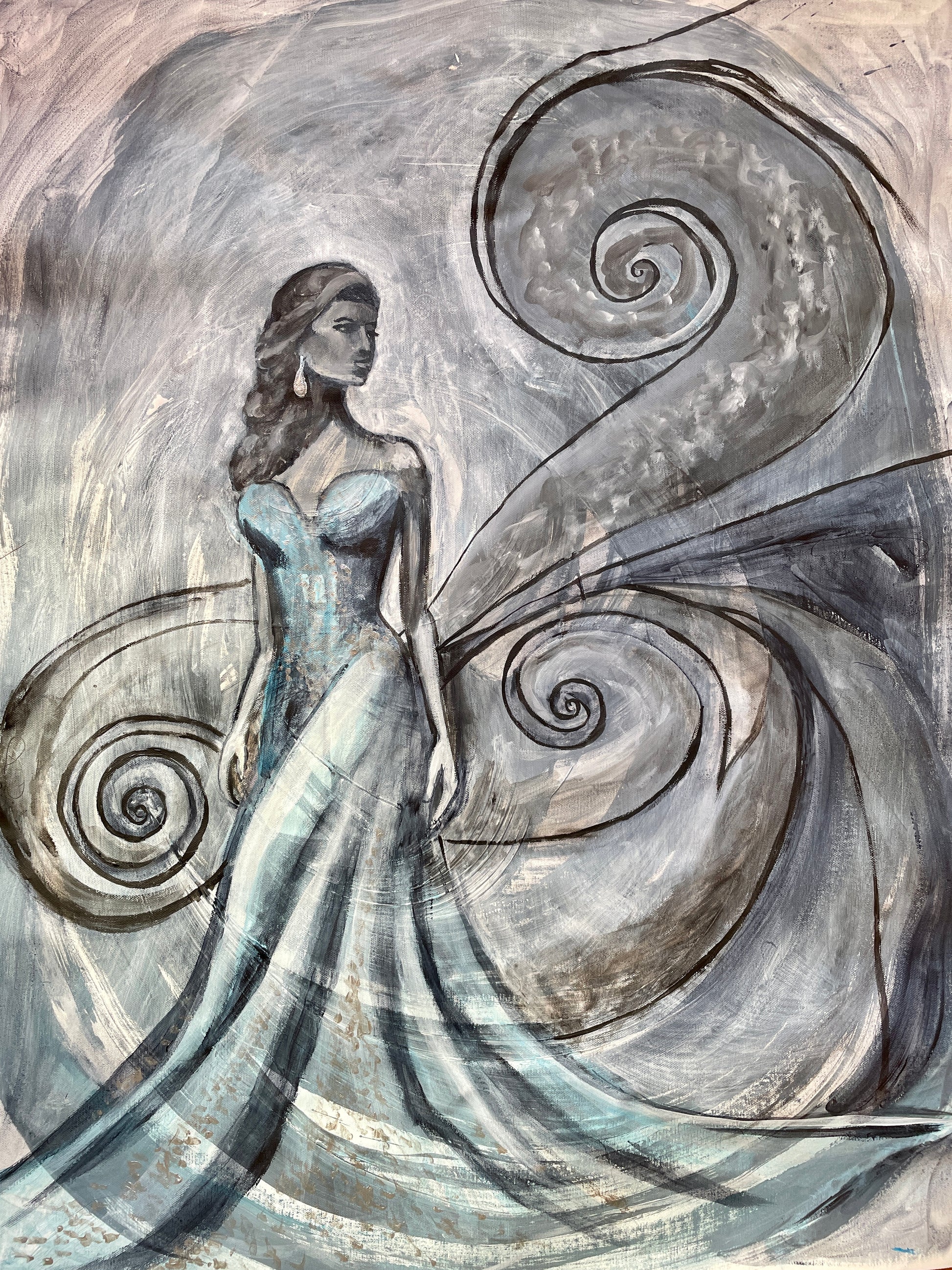 "Winter Party" captures the elegance and magic of a grand winter evening, celebrating the sophistication and grace of a woman at the height of her confidence. Draped in a shimmering gown that mirrors the cool hues of icy blues and silvers, she exudes an aura of timeless beauty and poise. The intricate patterns in the background, reminiscent of swirling snowflakes and frosty winds, enhance the ethereal quality of the painting, immersing the viewer in the enchanting atmosphere of a winter celebration.