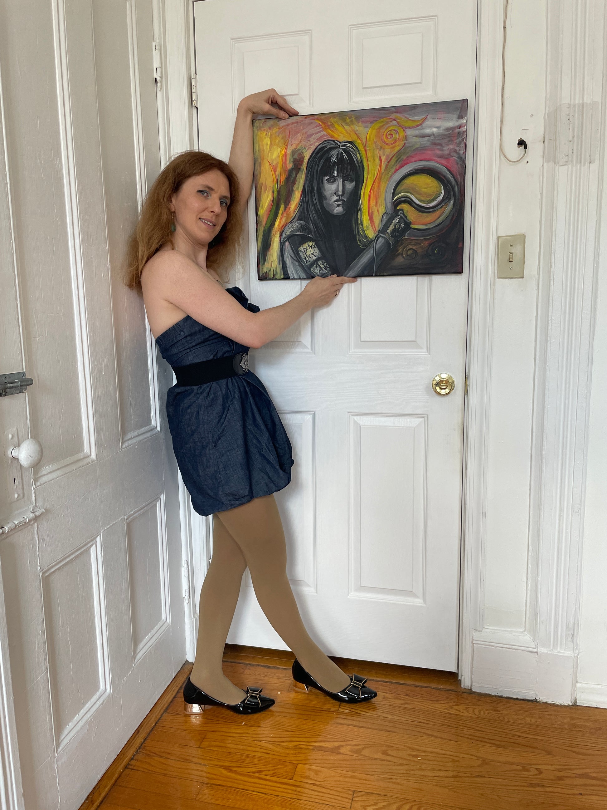 Rendered in bold acrylic brushwork, this piece blends realism with expressive color energy — flames of red and gold twist around her, highlighting her weapon mid-motion and her unwavering gaze. It’s not just a portrait; it’s a symbol of resilience, fierce independence, and timeless beauty.